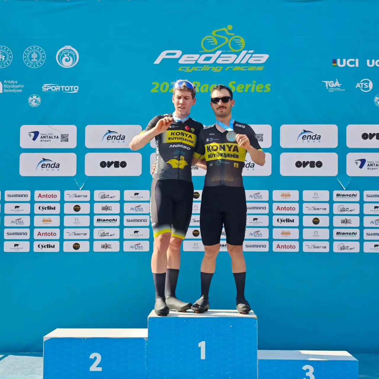 Konya Büyükşehir Belediyespor Bisiklet Takımı sporcularından Ramazan Yılmaz ve Mustafa Tarakçı, Antalya’da düzenlenen Uluslararası Pedalia Kriteryum Yarışı’nda kürsünün ilk iki basamağına çıkarak Konya’ya çifte gurur yaşattı.