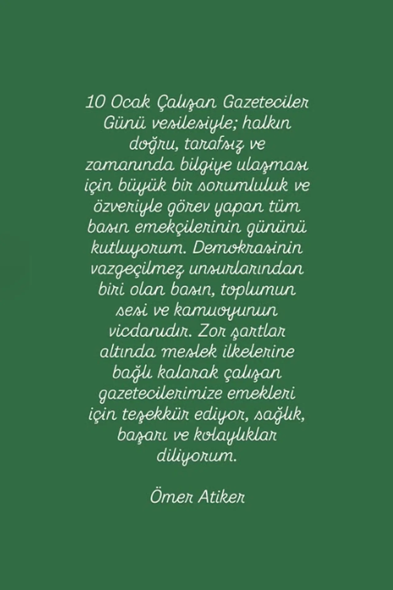 Başkan Atiker mesajında ayrıca, zor şartlar altında meslek ilkelerine bağlı kalarak görev yapan gazetecilere teşekkür ederek, sağlık, başarı ve kolaylık temennisinde bulundu.