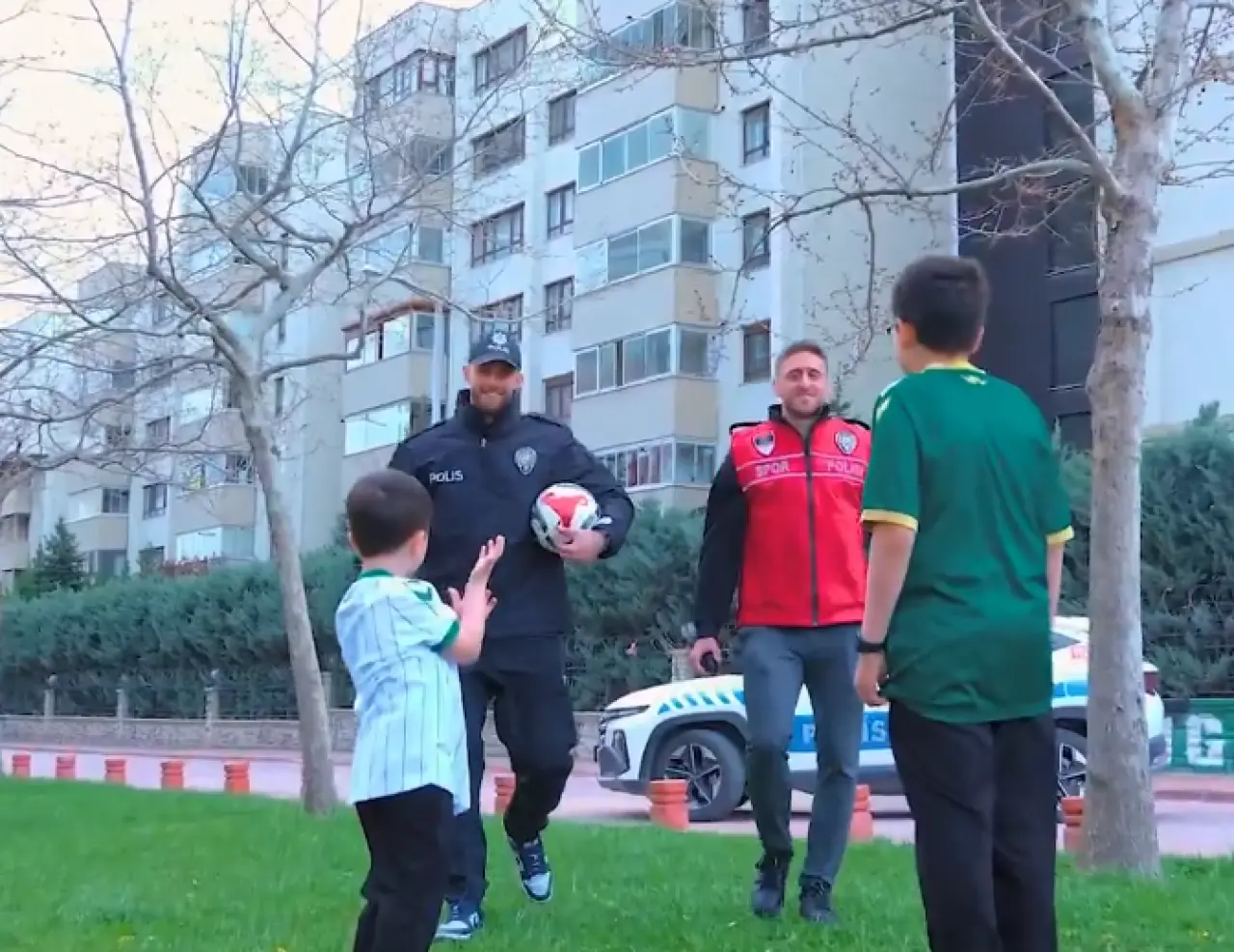 Polis üniformasıyla Melih İbrahimoğlu ve Berkan Kutlu, mahalle arasında top oynayan çocukların oyununa dahil oldu. Futbolcular, miniklere hem polis sevgisini aşıladı hem de keyifli vakit geçirdi.