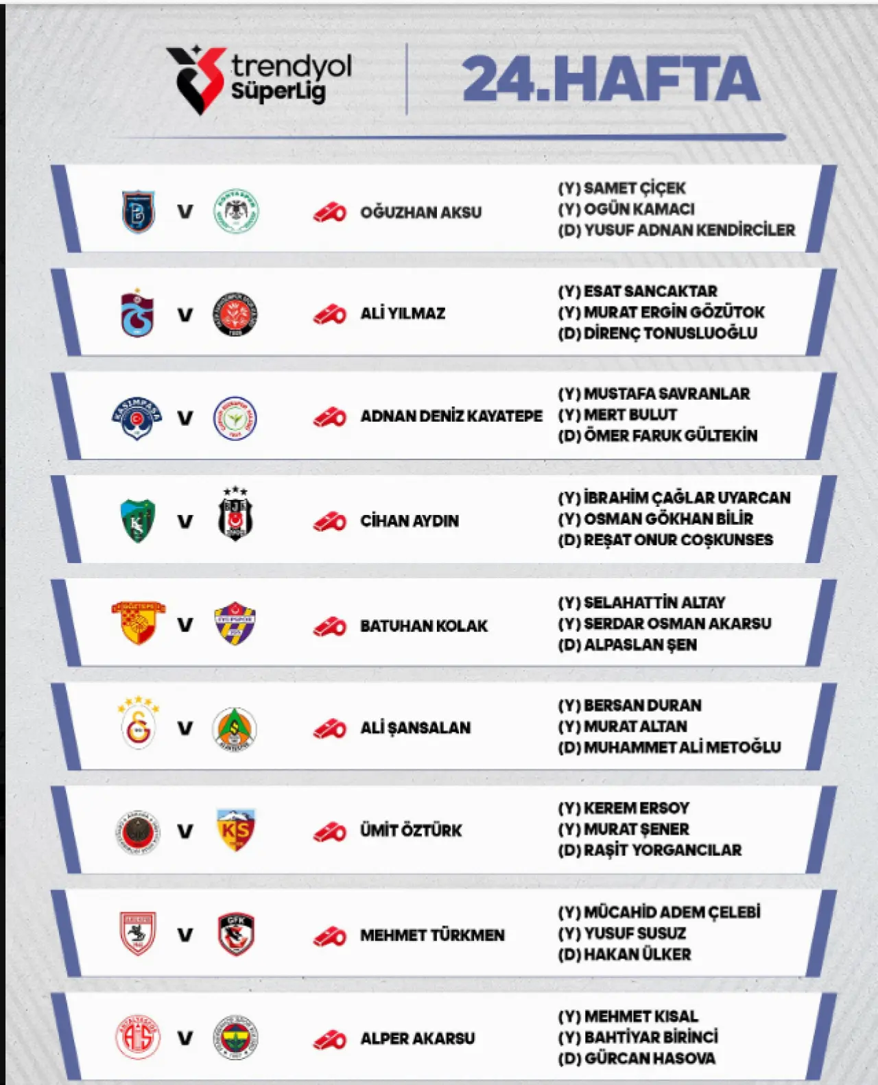 24. haftada oynanacak müsabakaların hakemleri şu şekilde;