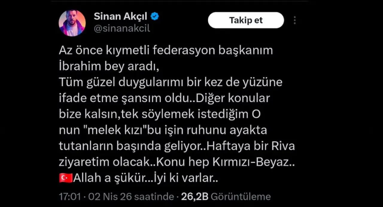 “Az önce kıymetli federasyon başkanım beni aradı. Haftaya bir Riva ziyaretim olacak. Konu hep Kırmızı-Beyaz..” diyerek sevincini paylaştı.
