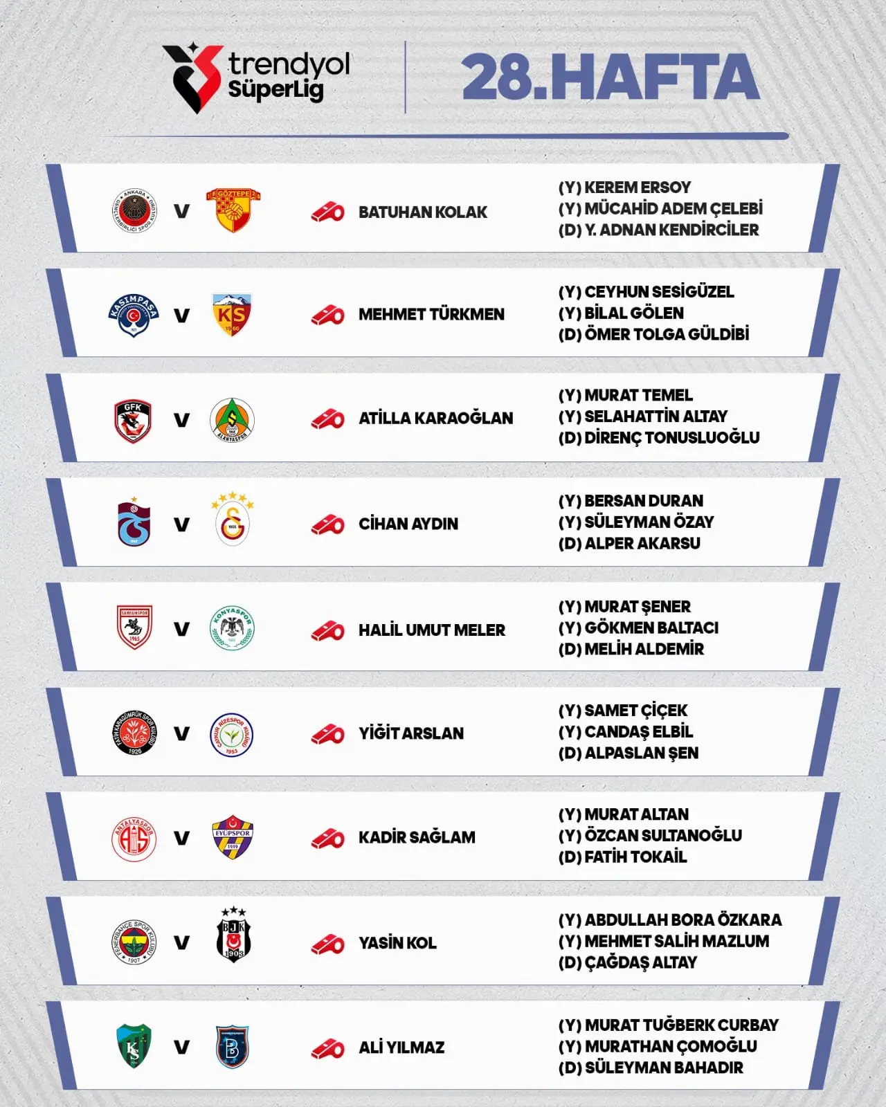 Haftada oynanacak müsabakaların hakemleri ise şu şekilde;